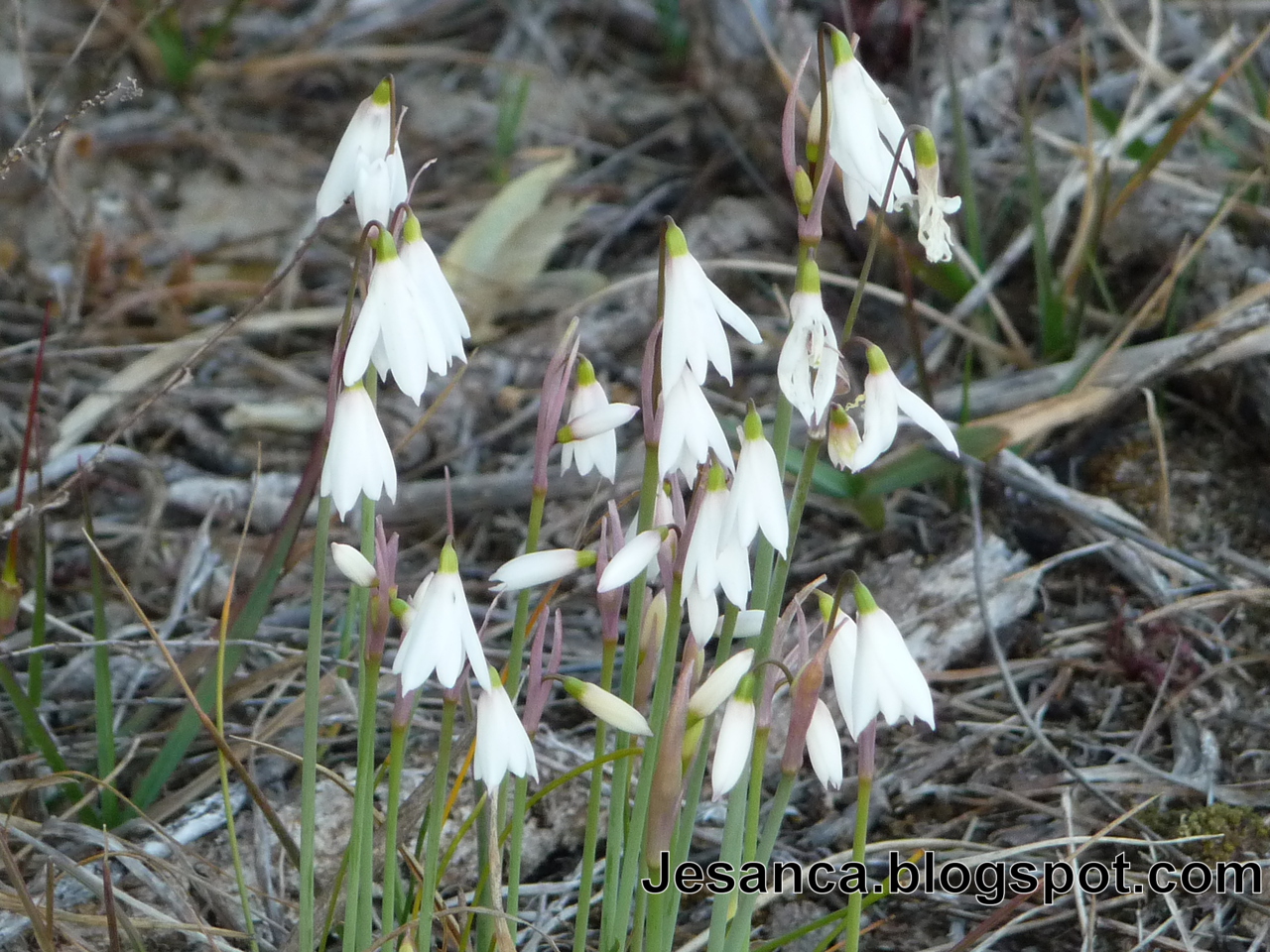 Planta perenne, bulbosa de hasta 20 cm de altura. No presenta hojas durante la floración, o bien empiezan a nacer. Las pocas hojas que tiene son de color verde oscuro y filiformes, de hasta unos 15 cm de largo por 0,5 mm de ancho. Tiene por lo general de 1 a 4 flores blancas, campanuladas, anchas, colgantes sobre un tallo afilo. Los tres pétalos exteriores están escotados en el ápice y a menudo son rojizos en su base. El fruto es una cápsula pequeña y durante su desarrollo el tallo se pone derecho.